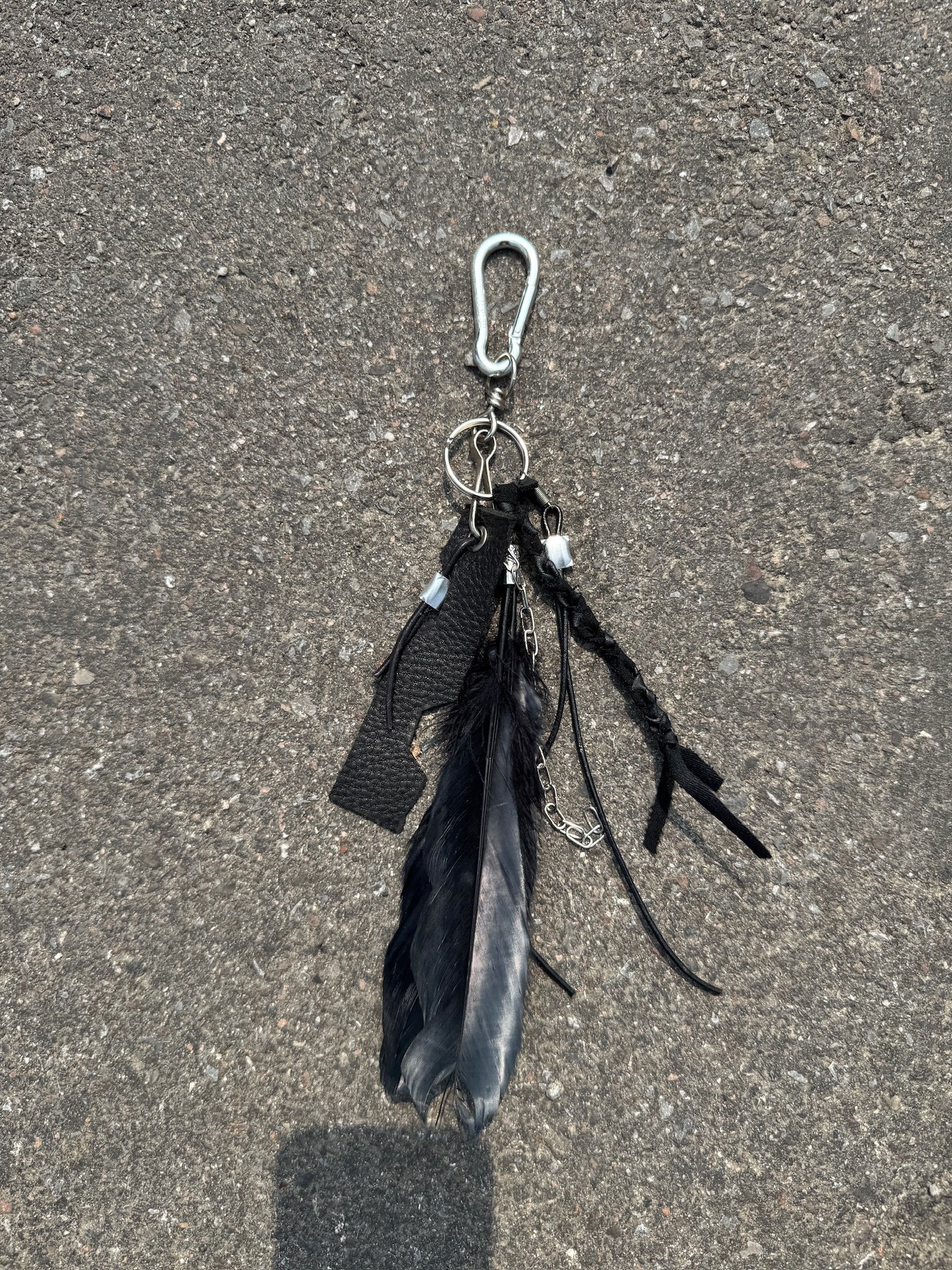 The keychain consists of a carabiner and a metal chain hanging down holding feathers. The charm also features various eyelets and other metal details and different leather and cotton accessories aswell.